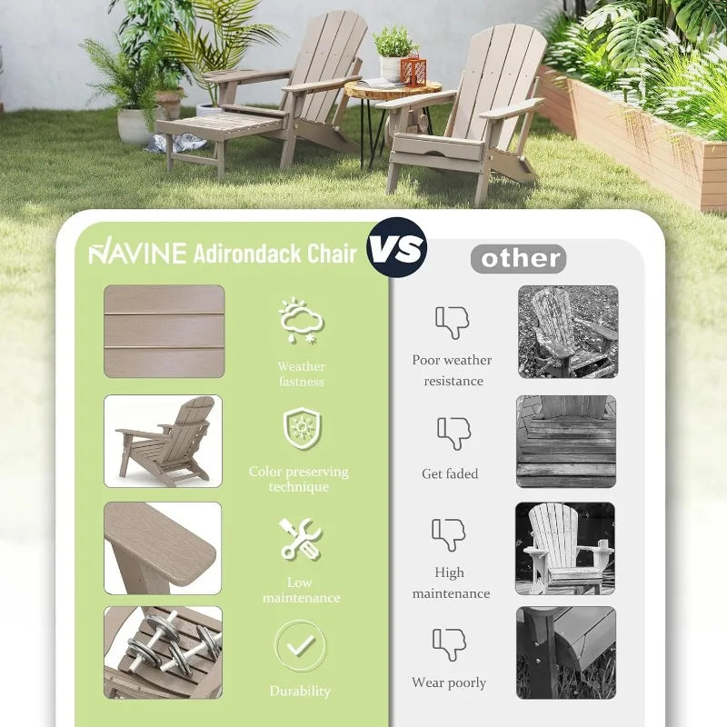- WERTHER-RESISTANT MATERIAL: NAVINE Folding Adjustable Adirondack Chairs are made of weather-resistant high-density polyethylene material. Compared with traditional wood and PS chairs, they are sturdy and anti-fading. Advantages of not splitting, cracking, chipping, peeling or rotting. Ideal for outdoor placement The NAVINE chair ensures long-term use even in all outdoor conditions.