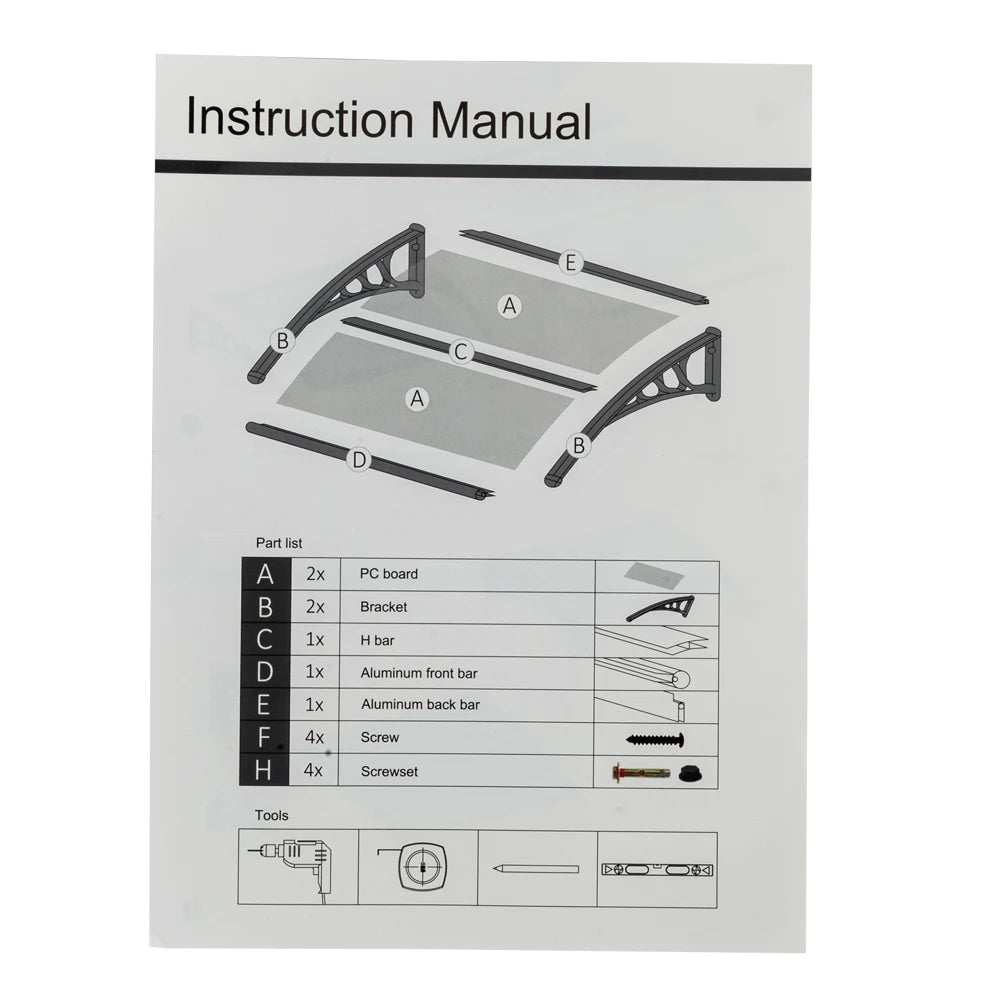 Build a mini shelter for resisting rain or scorching sun at the gate or window! This is a superb design integrating high-class ABS and polycarbonate materials, durable and wear-resistant to use. Aluminum brackets strongly sustain this canopy. It bulges to shape a small shield. Quite and easy to install and remove! It also acts a decoration for your home.