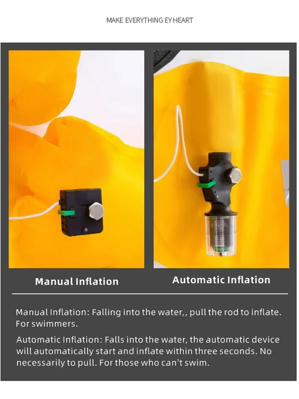 2. Zipper pocket for convenient storage of keys, waterproof camera, license, etc. Quadrate air bag tightly surrounds your body under your arms after inflated.